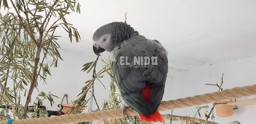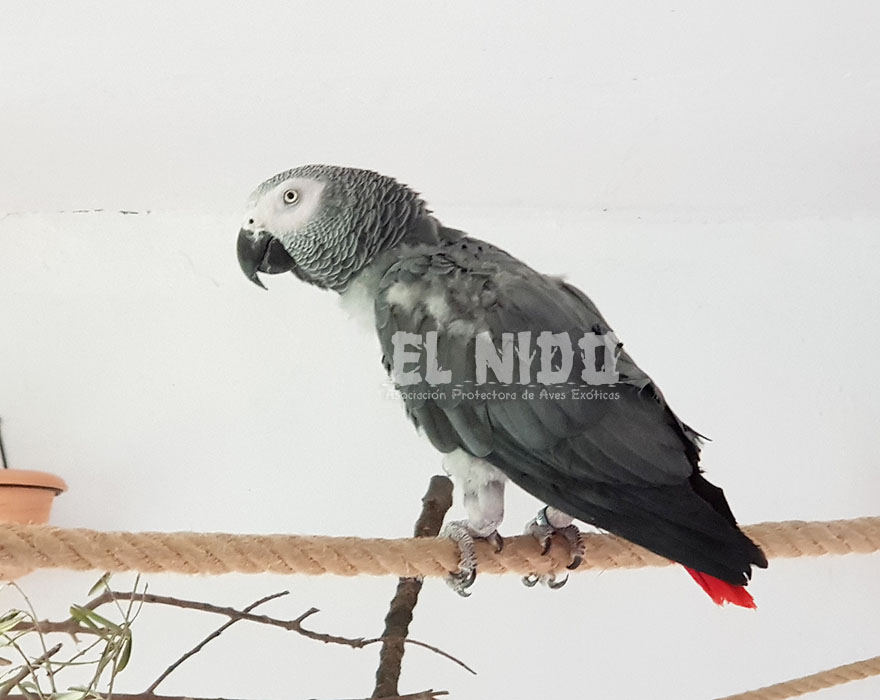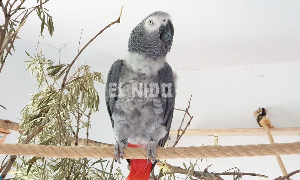 Es cedido porque no tenían tiempo para cuidarlo, muchas hora en la jaula y sin entretenimientos ni compañía humana, hizo que se arrancase la mayoría de sus plumas.