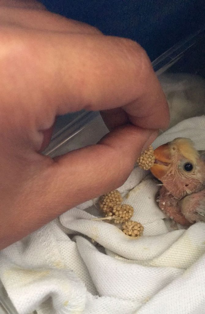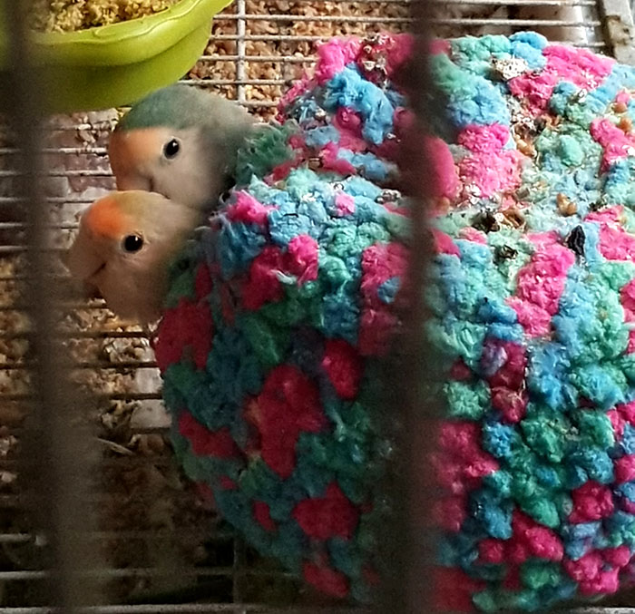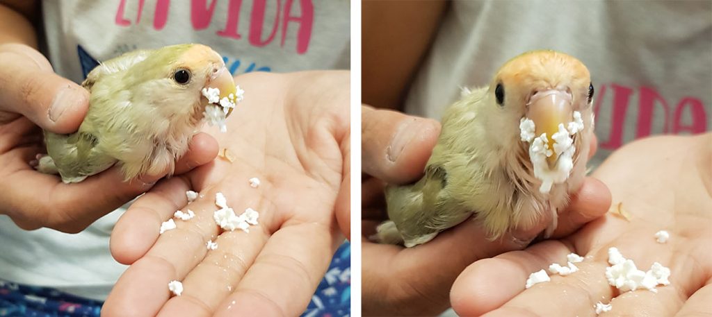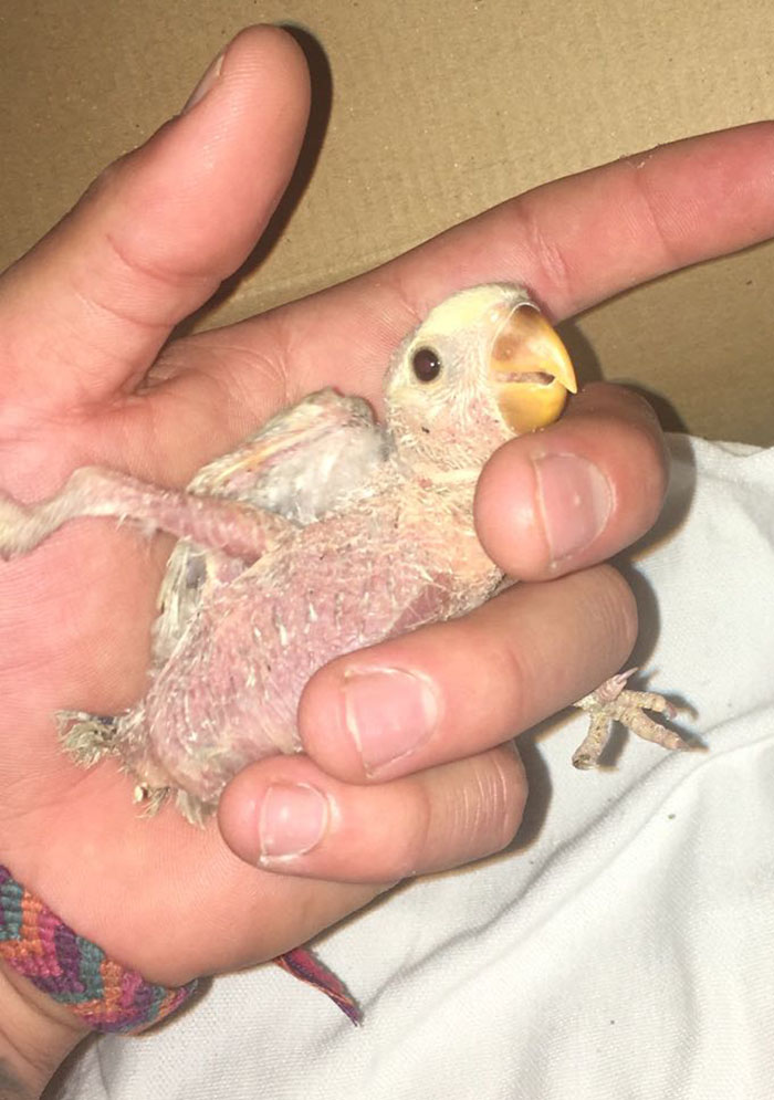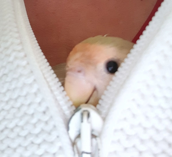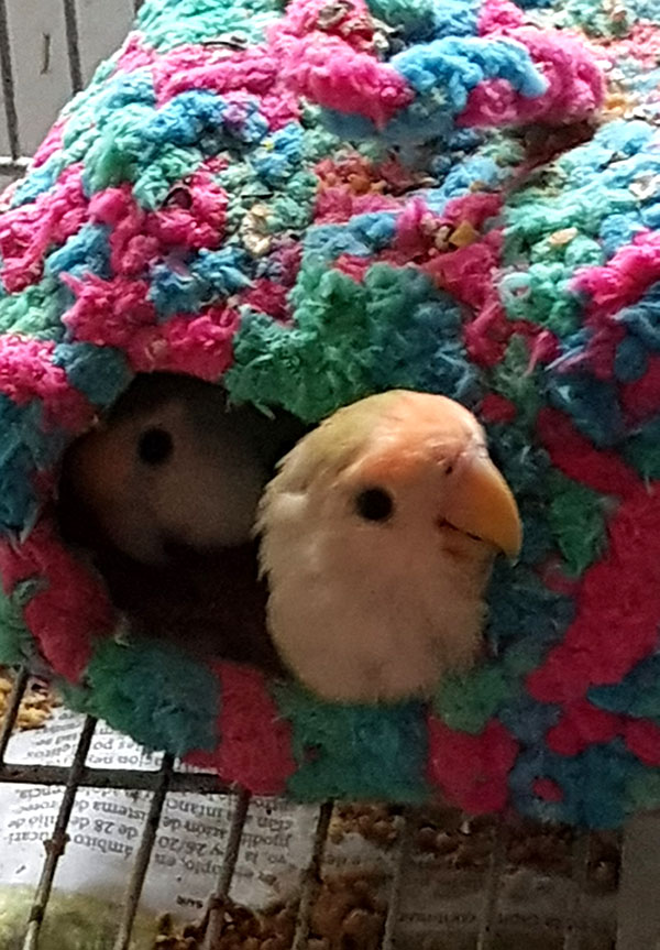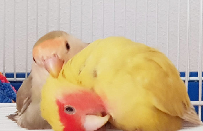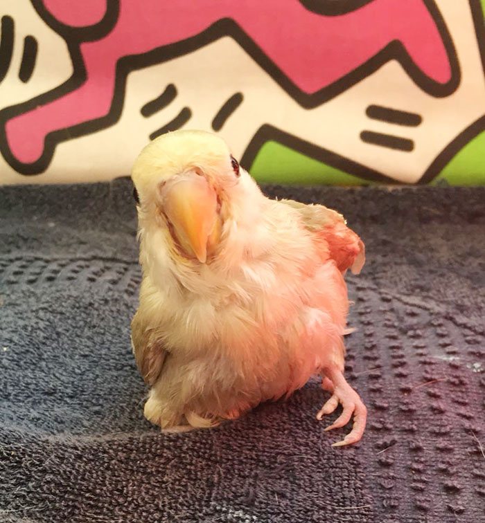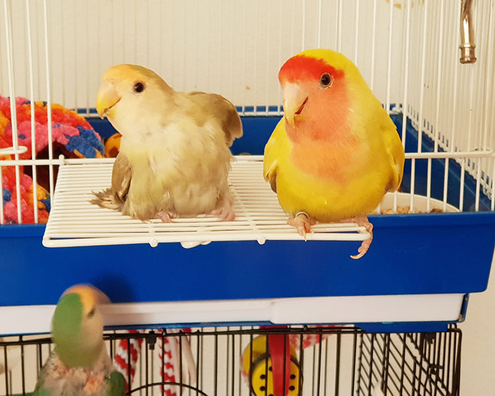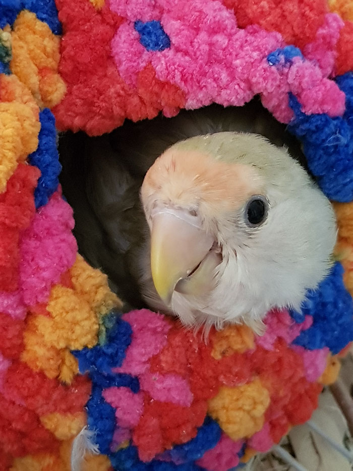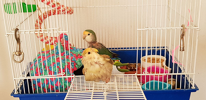 Winner (Agapornis Roseicollis) fue encontrada junto con otro agaporni con patas de rana, dentro de un contenedor de basura, metidos los dos en una jaulita, ambos con problemas de movilidad.
