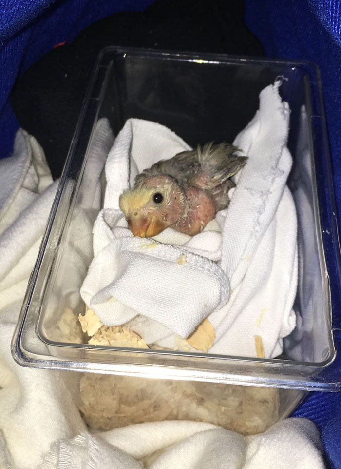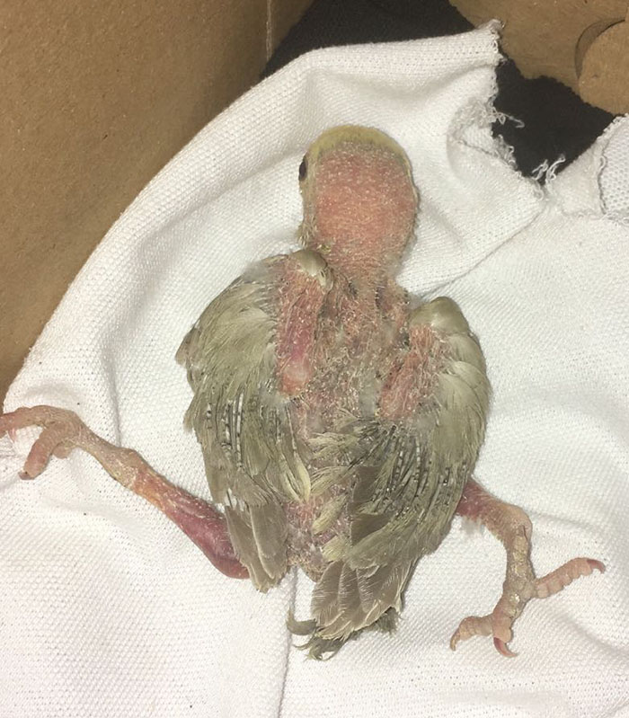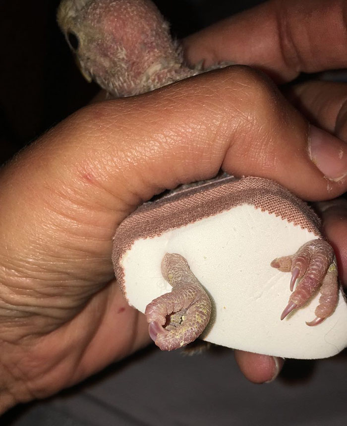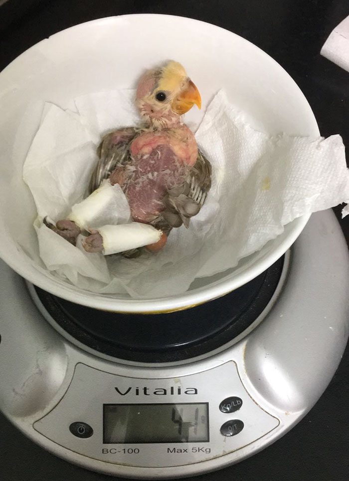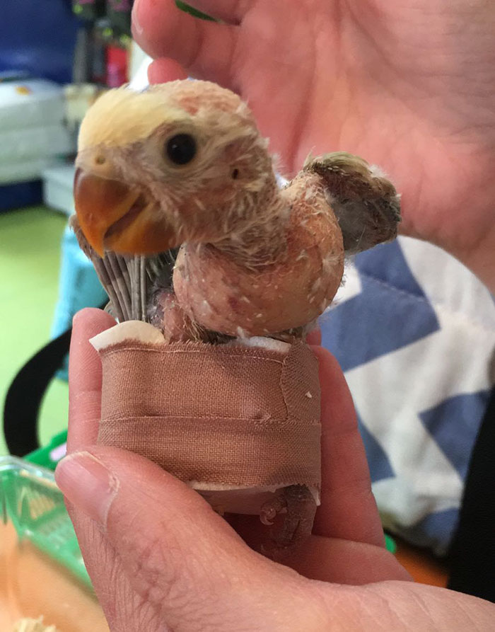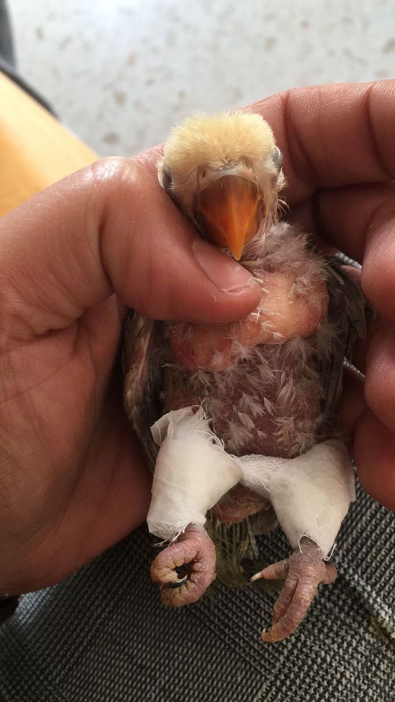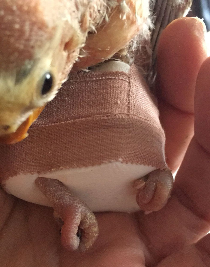 Se le puso correctores en sus patitas para intentar que se pudiese desplazar por sí misma y tener medianamente una calidad de vida con otras aves de su especie.