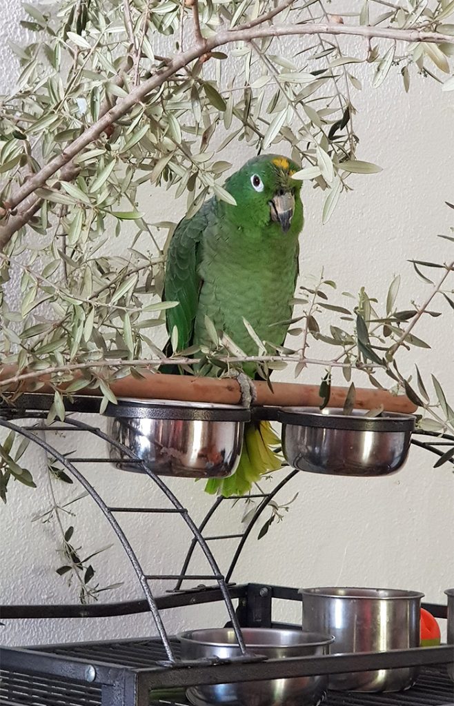 Lo primero que hicimos fue cambiarla de jaula, tuvimos que desmontarla porque por la puerta no cabía, la puerta era demasiado pequeña para su envergadura, la jaula era de ninfas, no podía ni abrir las alas y lo segundo fue llevarla al veterinario para que le recortaran esas  terribles uñas y tercero darle un baño al sol, como disfrutó de ese baño.