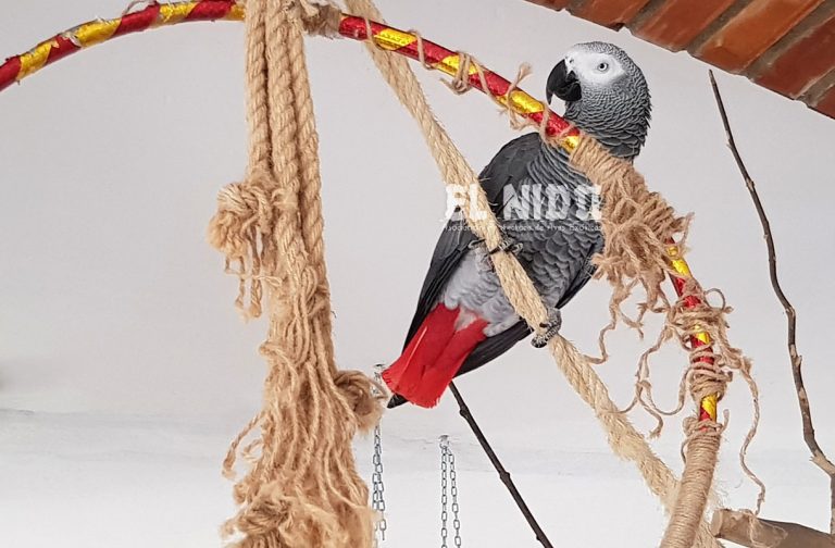 Es cedido porque no tenían tiempo para cuidarlo, muchas hora en la jaula y sin entretenimientos ni compañía humana, hizo que se arrancase la mayoría de sus plumas. No es un yaco sociable con otros yacos `pero si le gusta…